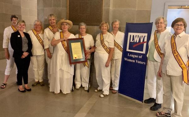 Local LWV Members attending (l to r): Mahree Skala, Brianna Lennon, Meredith Donaldson, Ellen Atkins, Marilyn McLeod, Ruth Milledge, Pam Springsteel, Joni O’Connor, Elaine Blodgett, and Carol Schreiber